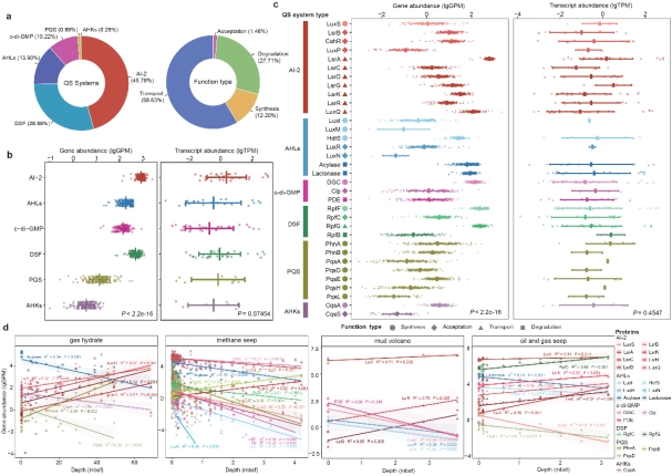 研究团队整合了来自全球17个深海冷泉站点的170个宏基因组和33个宏转录组数据,构建了强覆盖性的非冗余冷泉基因集,系统分析了群体感应基因的分布、互作机制和生态角色。结果表明,冷泉微生物群体感应系统极为丰富,涵盖AI-2、AHLs、DSF、c-di-GMP、PQS和AHKs六大类型,共识别出近30万条群体感应相关基因。这些基因在不同沉积深度和冷泉类型中呈现明显分层特征,显示群体感应调控与冷泉的地球化学梯度密切相关(图1)。