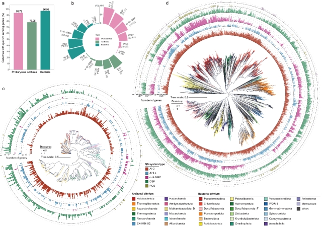 分析显示,94%的冷泉微生物基因组含有群体感应相关基因,涵盖了108个细菌门类和12个古菌门类(图2),表明群体感应在深海冷泉微生物界广泛存在。不同微生物类群展现出独特的群体感应信号系统偏好:细菌主要依赖AI-2、DSF和c-di-GMP系统,而古菌则偏向使用AI-2与AHLs系统。这种差异反映出冷泉微生物在长期演化中形成的多样化通讯策略。