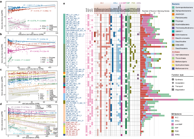 研究进一步发现,群体感应与冷泉生态系统中的关键生物地球化学过程密切相关。部分群体感应基因与甲烷厌氧氧化、硫酸盐还原、生物固氮和有机卤素脱卤等核心代谢基因呈显著正相关(图3),表明群体感应在碳、硫、氮及卤素循环中发挥协同调控作用。研究还揭示,不同功能类群在通讯方式上存在差异:厌氧产甲烷古菌主要依赖AI-2信号系统,固氮菌富含c-di-GMP相关基因,而硫酸盐还原菌则同时拥有多种信号调控途径,表明其在冷泉能量代谢网络中的重要地位。