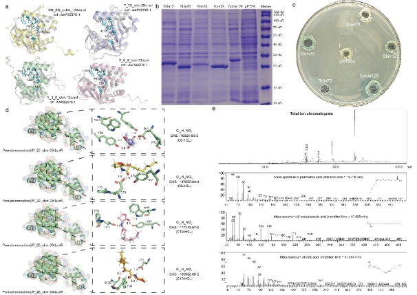 为验证群体感应的功能活性,研究团队对5个冷泉来源的LuxI基因进行异源表达,其中4个luxI具有诱导生成AHLs类信号分子的能力(图4)。分子对接结果表明,受体LuxR可与多种AHL分子结合,证实了LuxI-LuxR信号系统在冷泉微生物中的功能性存在。结合代谢组学分析,研究在冷泉沉积物中检测到具有潜在群体感应抑制剂作用的多种脂肪酸分子,如棕榈酸、油酸和十六烯酸,提示冷泉环境中群体感应与信号淬灭(quorum quenching)过程可能并存,构成动态的信号调控网络。
